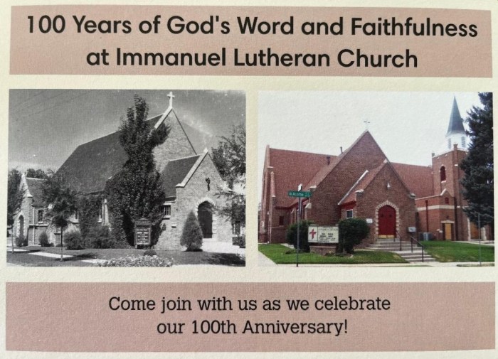 The members of Immanuel Evangelical Lutheran Church invite you to celebrate our 100th anniversary on Sunday, August 24th, 2025!